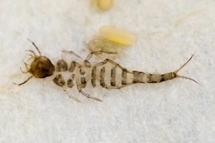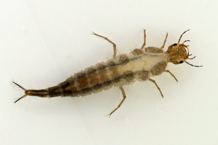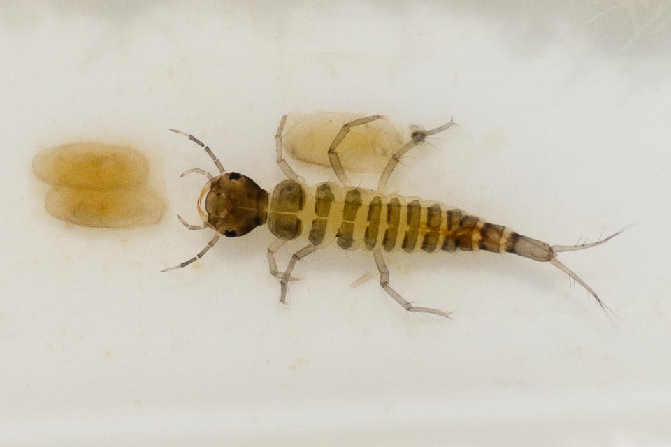 The contrast of the images of eggs, larva and exuviae has been increased. The eggs are yellowish white and the larva looks a little brighter and more transparent in the original.